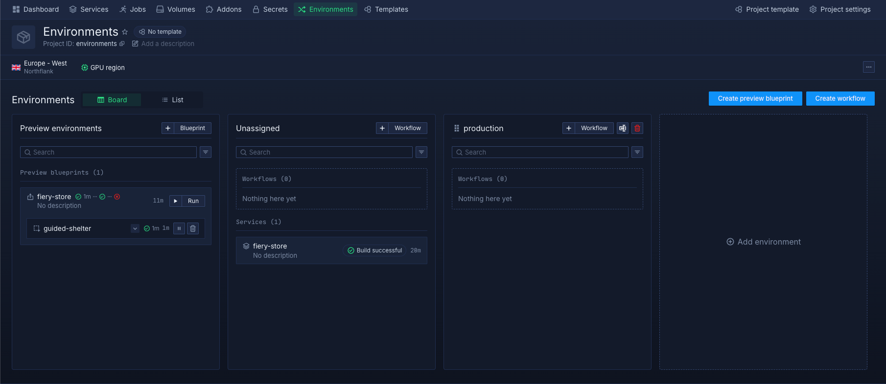 The new environment appears as a column in the environments board view. You can create multiple environments to match your deployment stages.