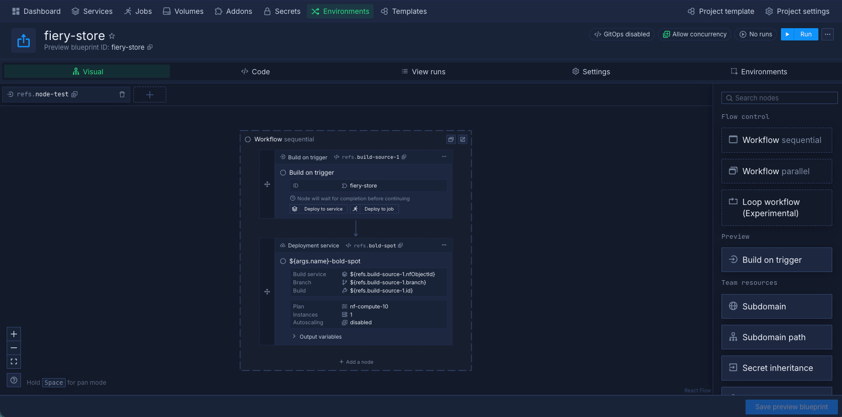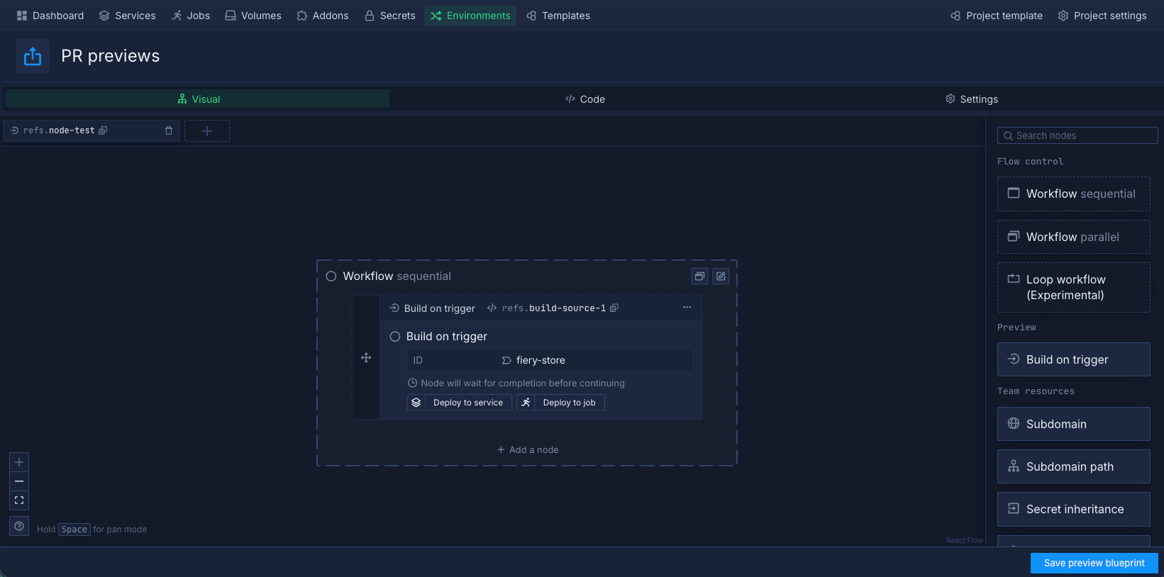 The visual editor lets you build the workflow that creates your preview environment. You'll connect nodes together to define what gets deployed: starting with building your code, then deploying it to services, and optionally adding databases or other resources.