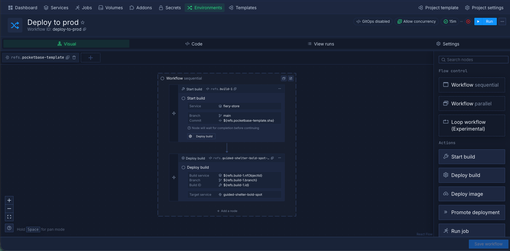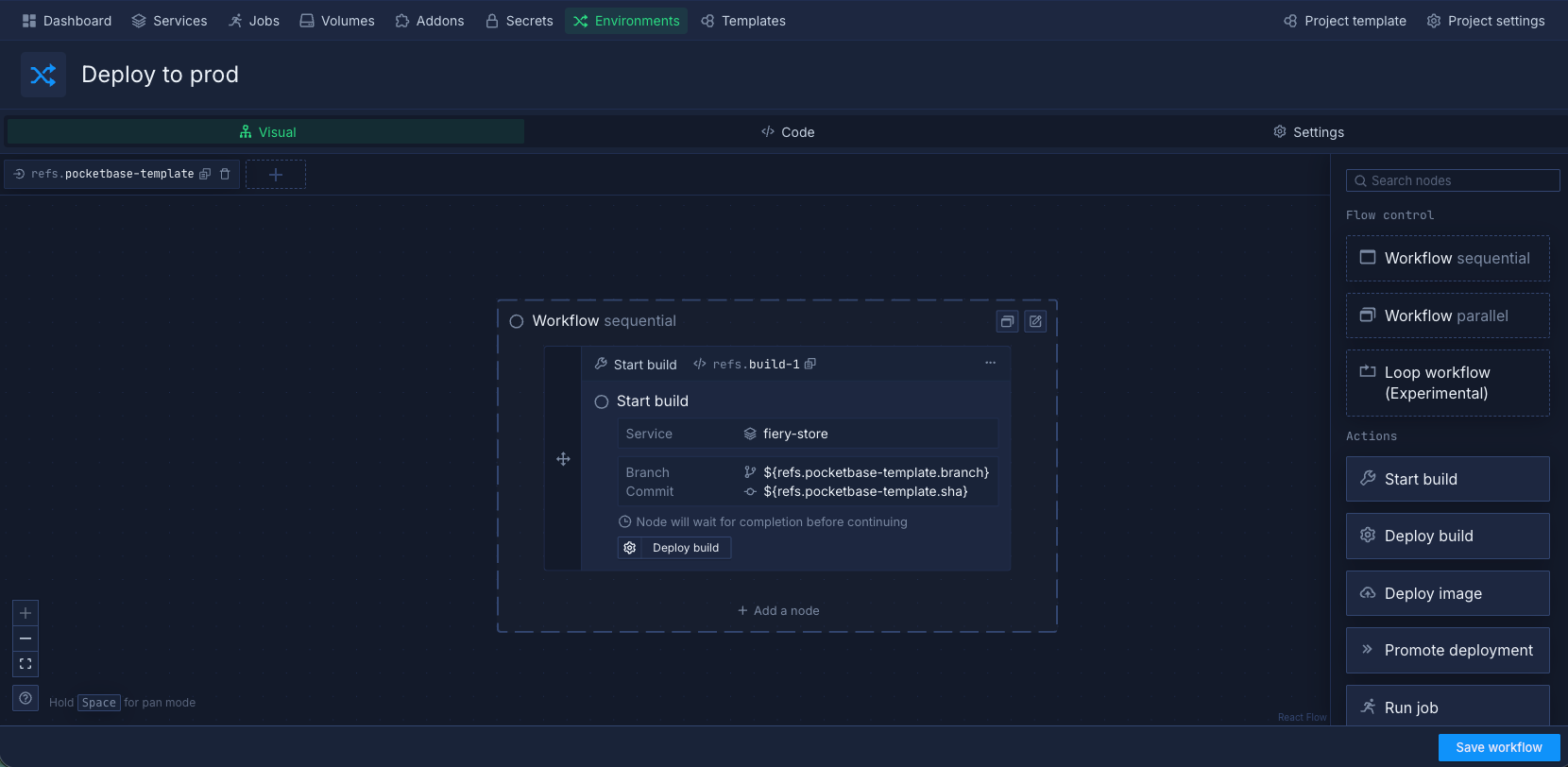 Additional nodes can be added to the workflow, including databases, jobs, and volumes.